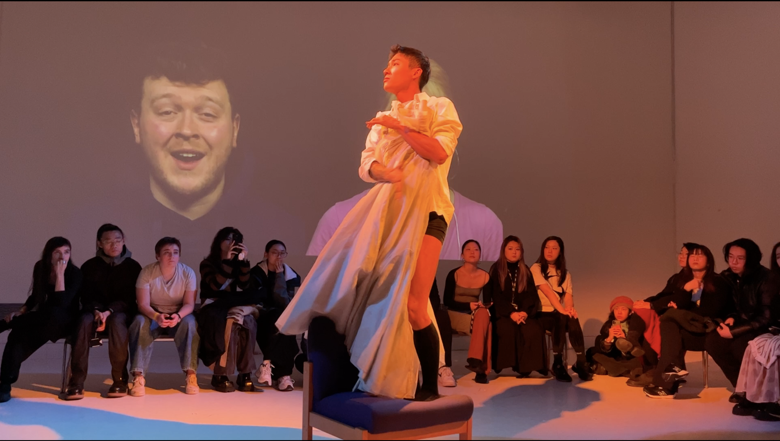 One audience moment clarified the enquiry more sharply than my own explanations could. During a projected sequence that indirectly referenced physiological shame, I noticed spectators avert their gaze. Several turned their heads away from the most confronting image. Yet, because projection surrounded them, avoidance did not resolve into escape. Instead, a turned head met another wall and another enlarged face, so that an attempt to look away produced an unexpected eye contact with the projection. In that moment, spectatorship appeared less as free choice and more as a field of forced relations. Refusal became a kind of encounter. What might be described as “internal” (shame, hesitation, self-protection) became legible as spatial behaviour, shaped by the environment’s distribution of gaze.